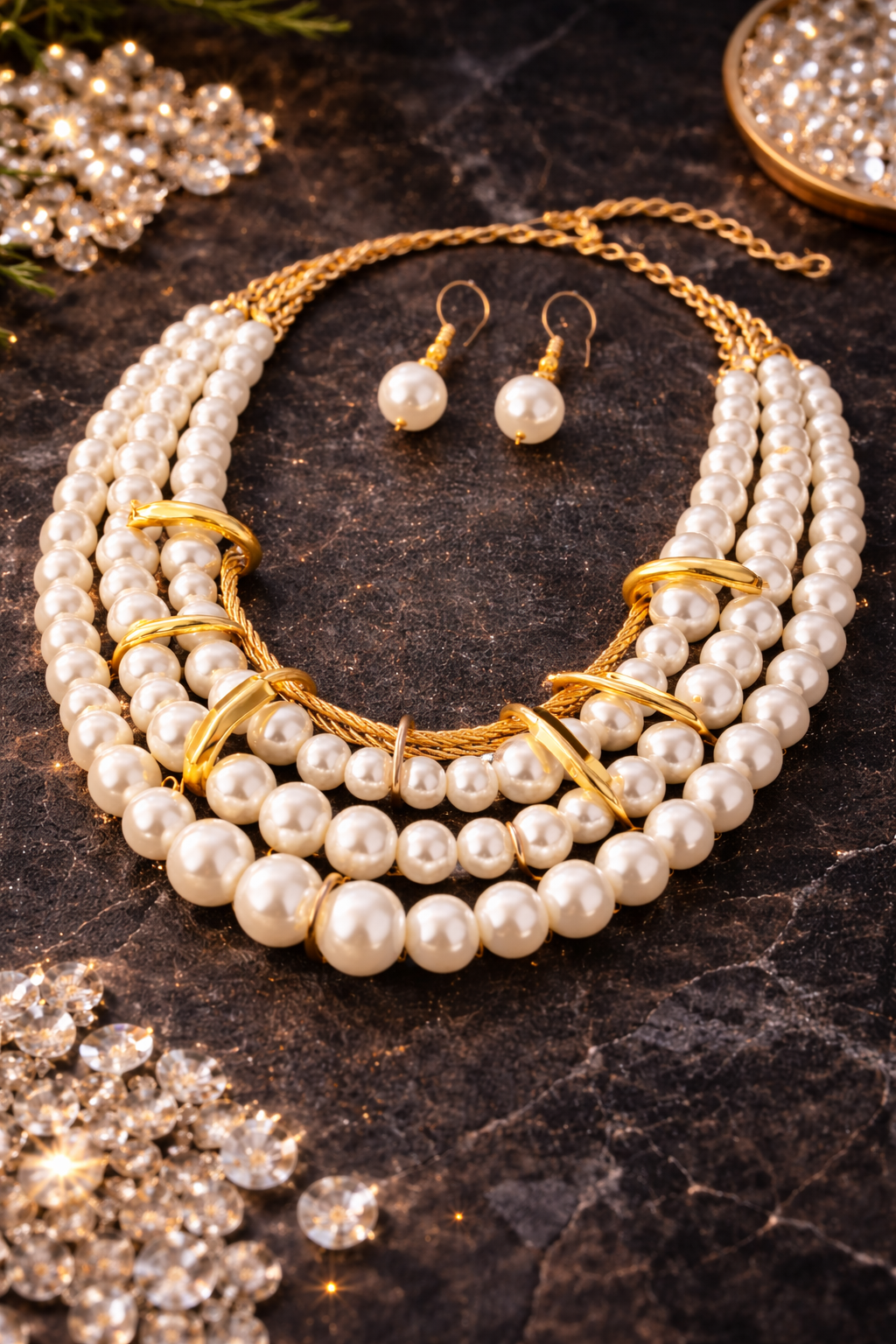 Elegant multi-strand pearl-look choker necklace with matching pearl-look drop earrings. This adjustable necklace is designed to be worn as a chic choker or slightly lower for versatile styling. Featuring luminous pearl-style beads paired with polished gold-tone accents, this statement jewelry set delivers timeless elegance without the cost of fine pearls.